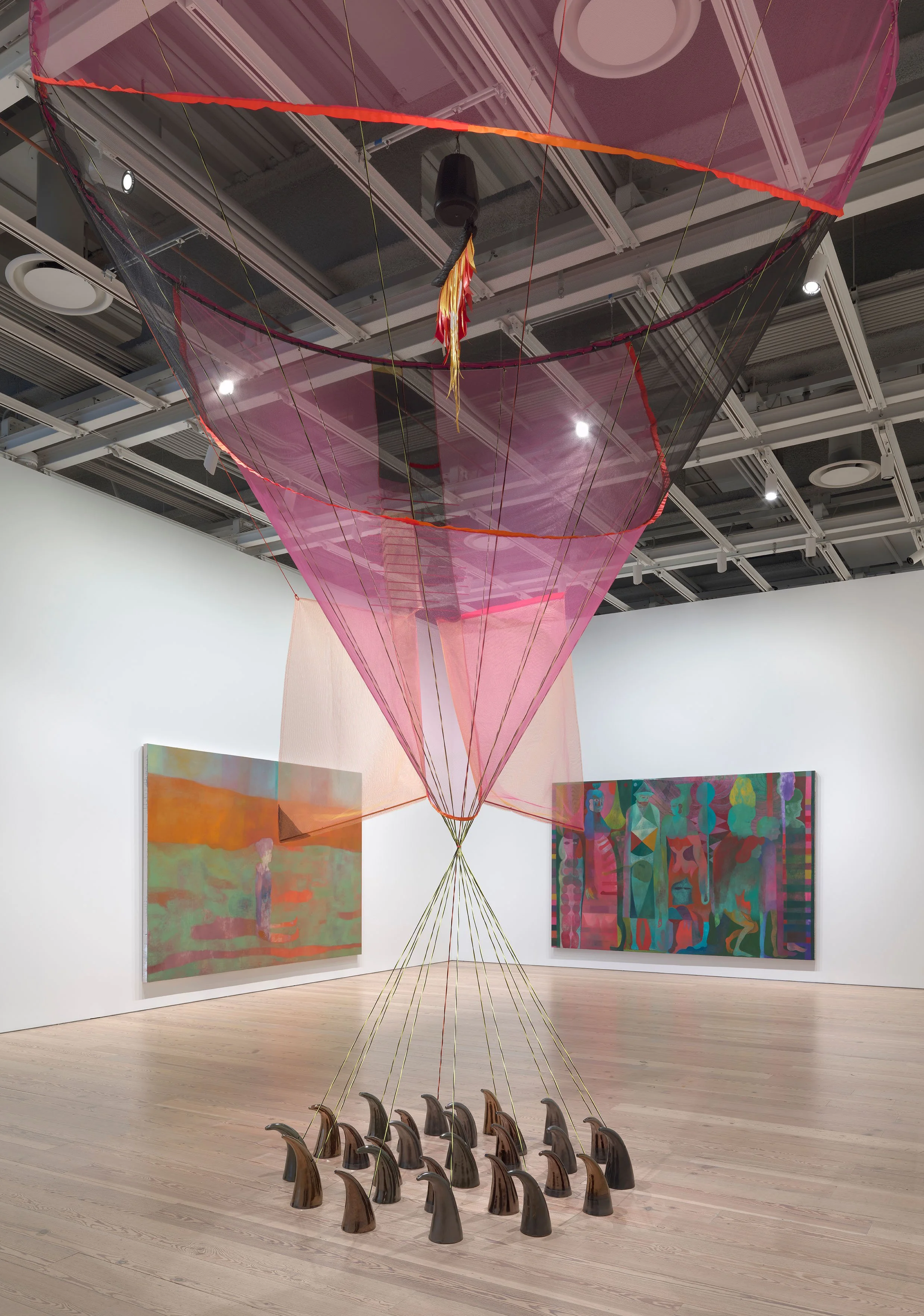 Using a variety of materials such as crenolyn, steel, ceramic, nylon, and fiberglass, Luger creates an installation that immerses the viewer in an intimate space where dreams are containers for collective building. The installation asks us to consider if our current world is upside down, what direction might our future world face?